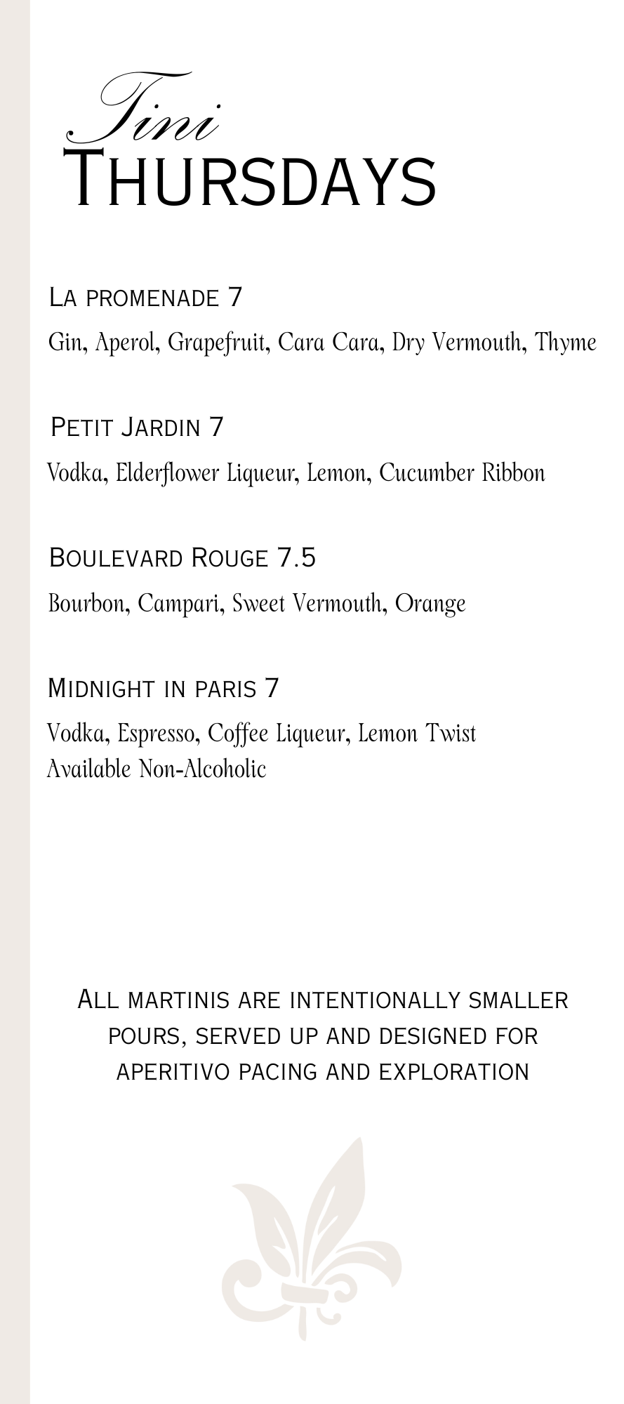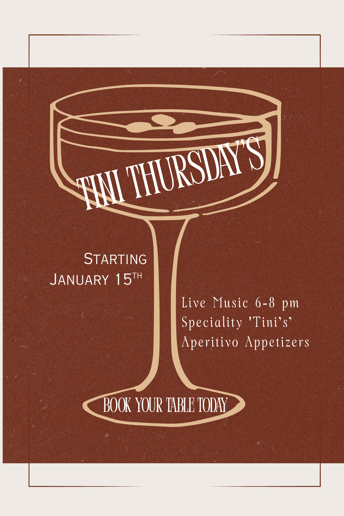 Tini Thursday’s every week with live music, aperitivo style martinis and speciality snacks! We can’t wait to see you there.